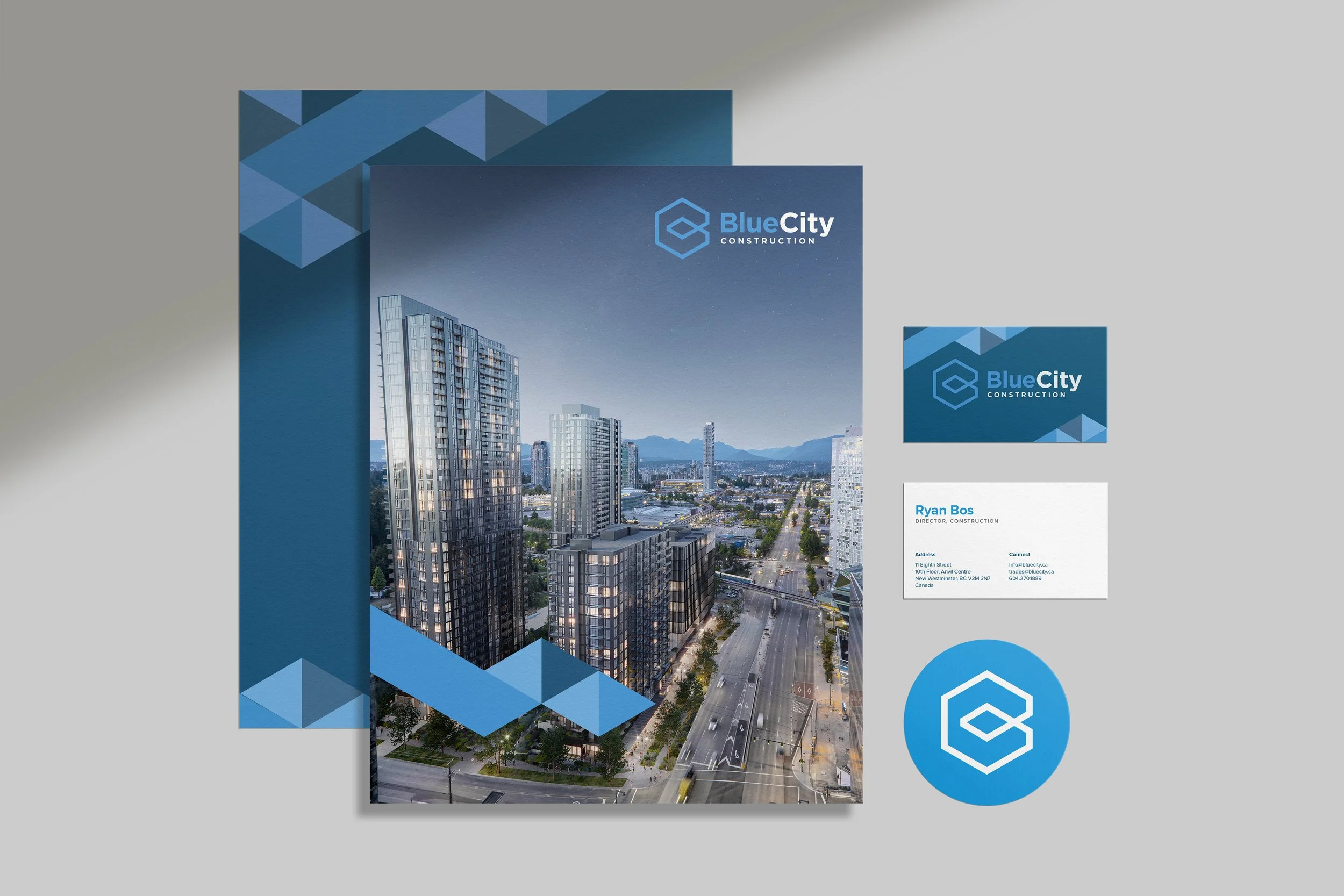 The geometric logo resembles a city building constructed of the letters “B” and “C” to represent BlueCity. Geometric shapes are used throughout their materials as a graphic element echoing BlueCity’s desire to create innovative, sustainable projects and communities in which people can live, work and play.