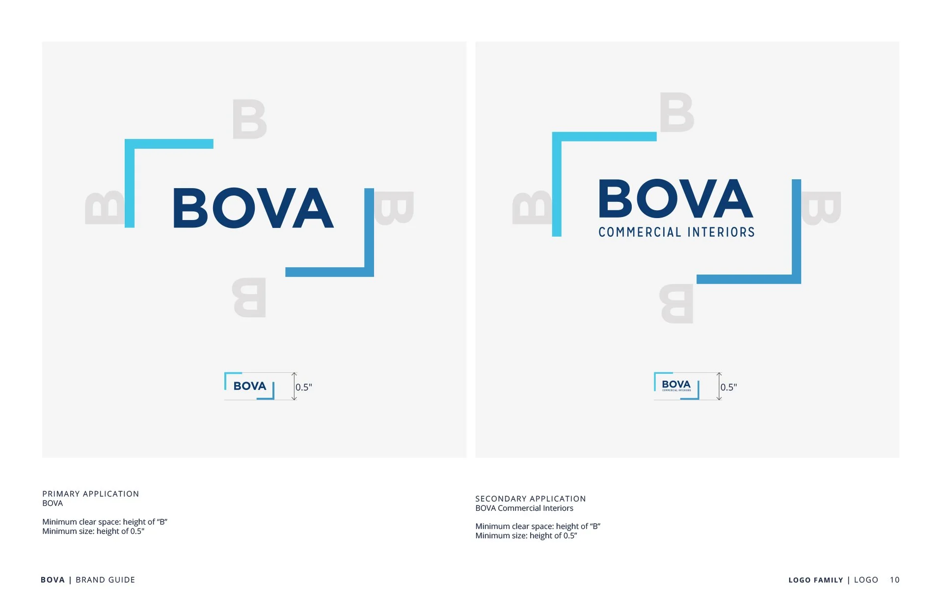 Taking design cues from building plans, we gave the logo more of a design and build feel. The two sections of the triangle icon in BOVA’s original logo were repurposed to create corner brackets, framing the word BOVA. These corner brackets echo the lines used in blue prints to denote walls, visually depicting BOVA’s specialty—interior commercial spaces.
